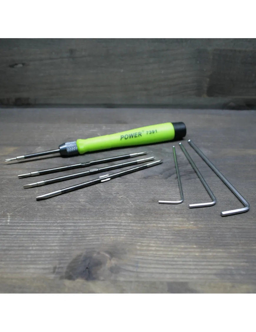 • Набор с четырех двухсторонних отверток разного диаметра с универсальной ручкой к ним