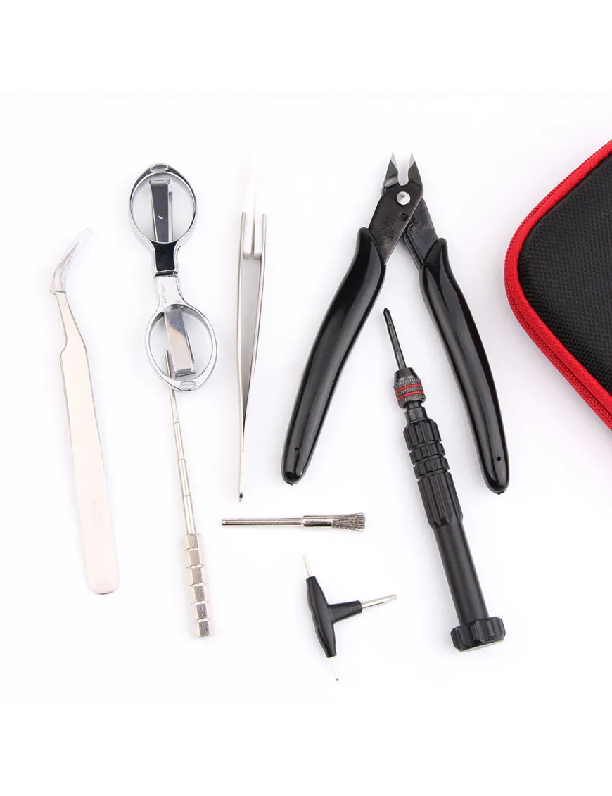 Компактный набор инструментов, порой так необходимых, для настоящего вейпера. Нет возможности зайти в вейп шоп за намоткой? С помощью этого набора, быстрая и эффективная намотка спиралей и замена ваты, обеспечена. В футляре на застежке молнии удобно расположены инструменты.
