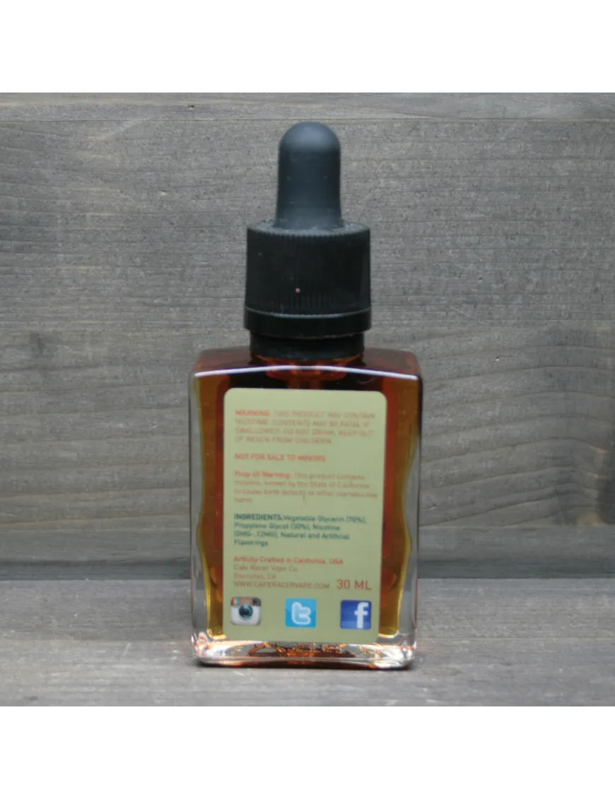 2007 год, побережье Тихого Океана, Калифорния, Соединенные Штаты Америки, ведущий производитель премиальной жидкости для электронных сигарет Cafe Racer. Основные цели которые преследуют с момента основания компании: это разработка уникальных рецептов, дабы удовлетворить своих клиентов, использование в производство только высококачественных ингредиентов и миллионный сегмент людей, которые еще не избавились от вредной привычки курения сигарет наполнены смолами, табаком и прочими губительными составляющими. Больше чем полгода ушло у лаборантов-миксологов Cafe Racer, дабы подарить миру насыщенную линейку вкусов. Вкусы быстро идентифицировали себя в мире вэйп индустрии, заработали массу наград считаясь лучшими в своем вкусовом сегменте и что самое главное завоевали сердца истинных