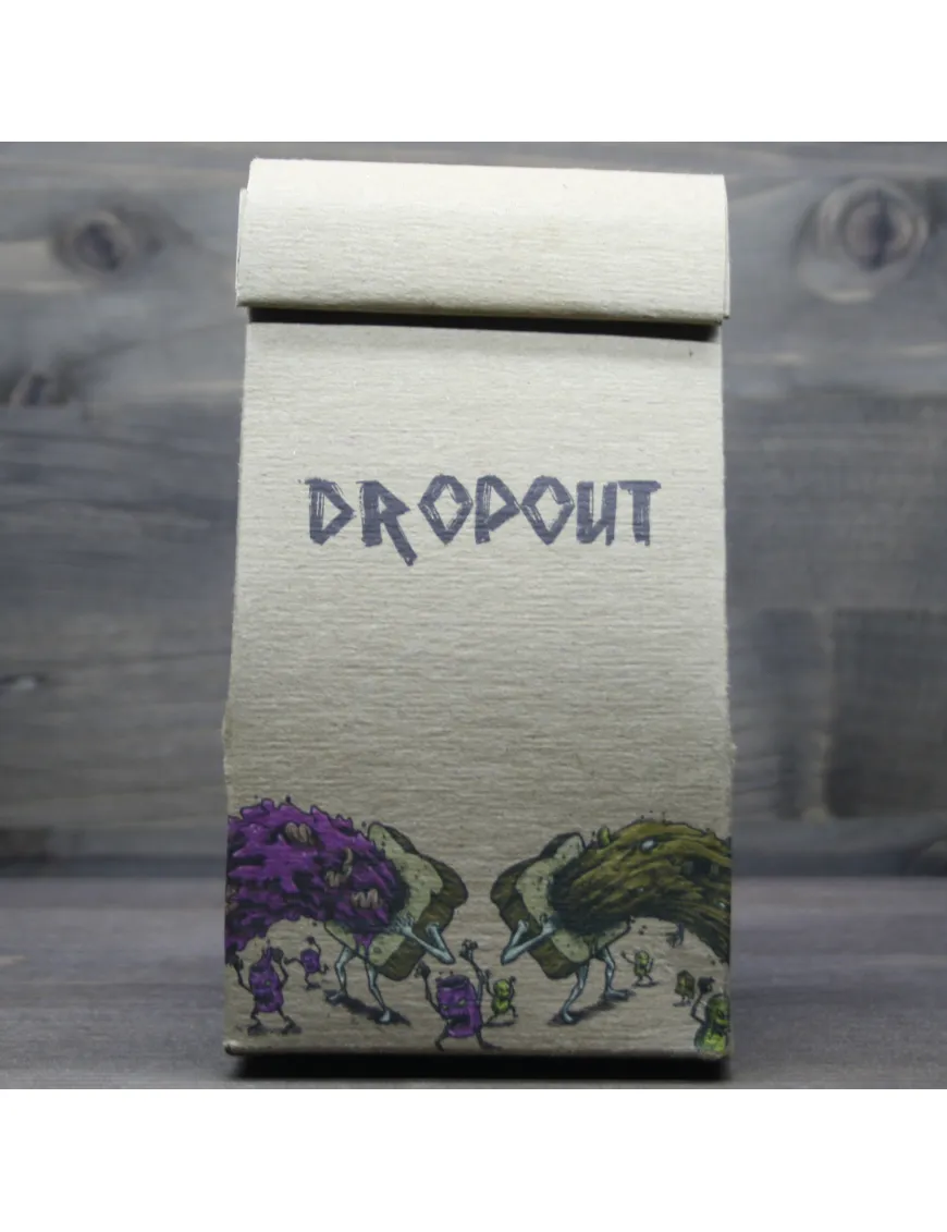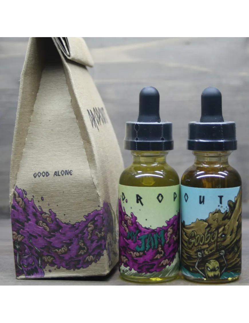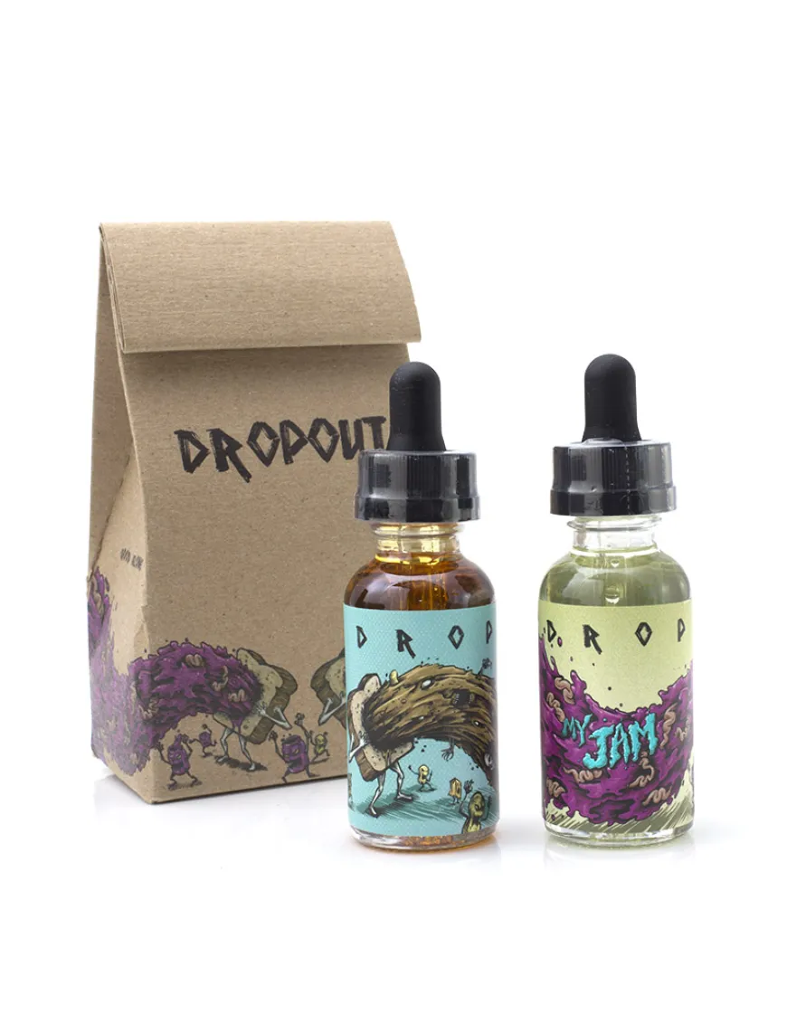 Drop Out – еще одна линейка жидкости от производителей Bad Drip. На этот раз, парни решили поэкспериментировать и создать комбинированный, двух компонентный вкус. Идея в том, что можно парить каждый микс отдельно, но при смешивании получается третий продуманный и сбалансированный вкус. Вы не сможете приобрести только один вкус из линейки, так как обе жидкости поставляются в единой картонной упаковке, которая стилизована под бумажный пакет для еды знакомый нам по американским фильмам. Кстати, надо отдать должное парням из Bad Drip, упаковка отлично изготовлена, стиль ее продуман и вообще, крутой концепт и реализация! Внутри упаковки находятся бутылочки с заветной жидкостью. Привычные стеклянные бутылочки, с хорошим дизайном этикеток и т.д. и т.п. в общем, все как в правильном премиуме… Давайте пробовать!